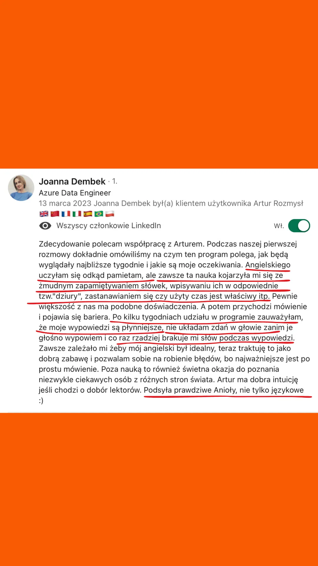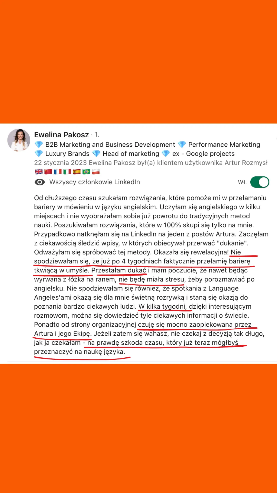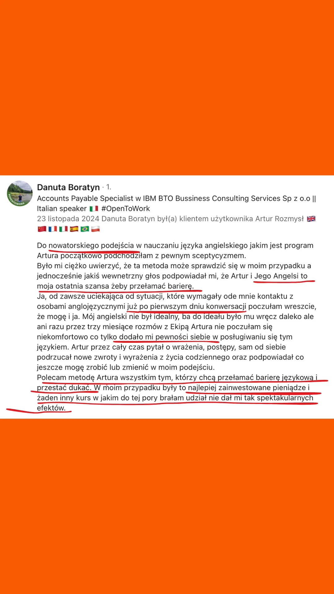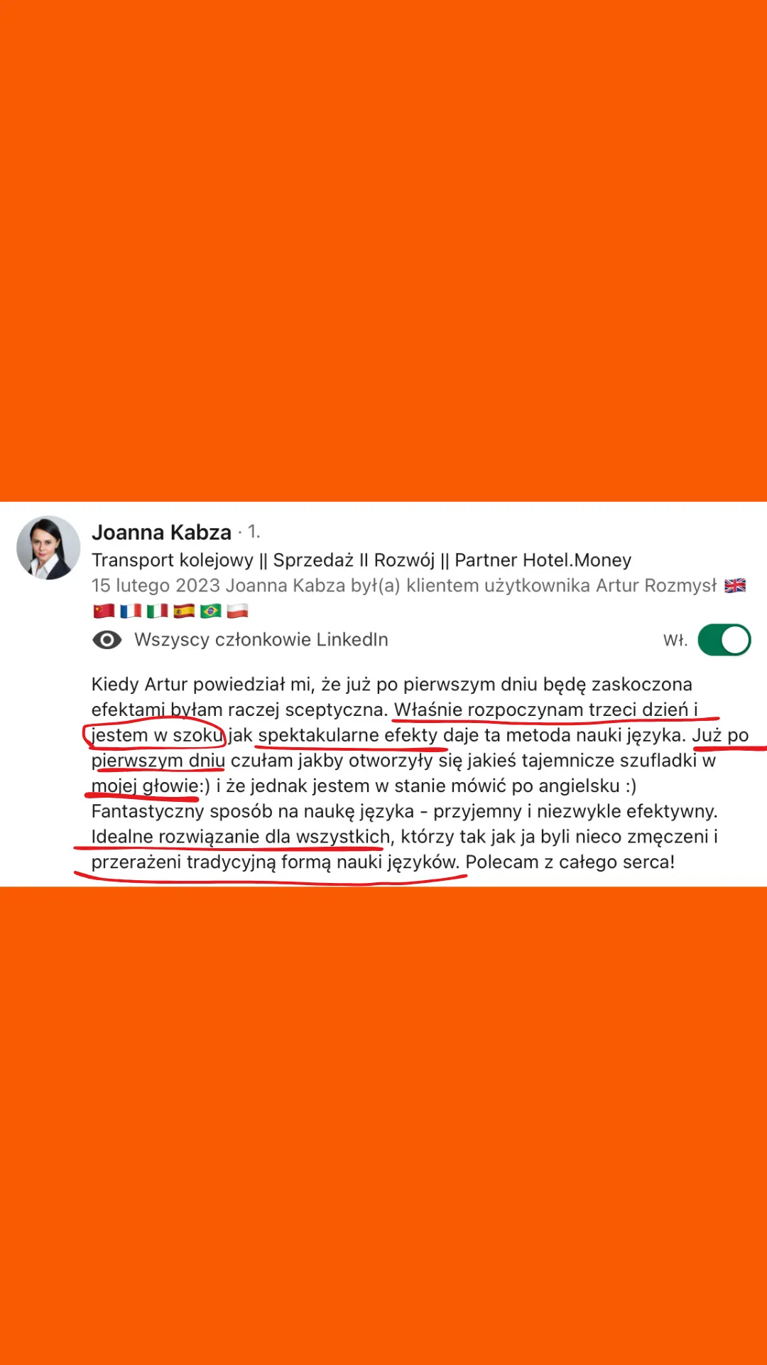 Wszystkie recenzje zamieszczone na tej stronie pochodzą od rzeczywistych klientów. Wyniki przedstawione tutaj nie są standardowe i nie stanowią gwarancji podobnych rezultatów. Indywidualne osiągnięcia mogą się różnić w zależności od Twoich zdolności, doświadczenia, zaangażowania oraz nieprzewidzianych czynników. Firma nie przeprowadziła jeszcze analiz dotyczących wyników swoich typowych klientów, dlatego Twoje rezultaty mogą być odmienne.